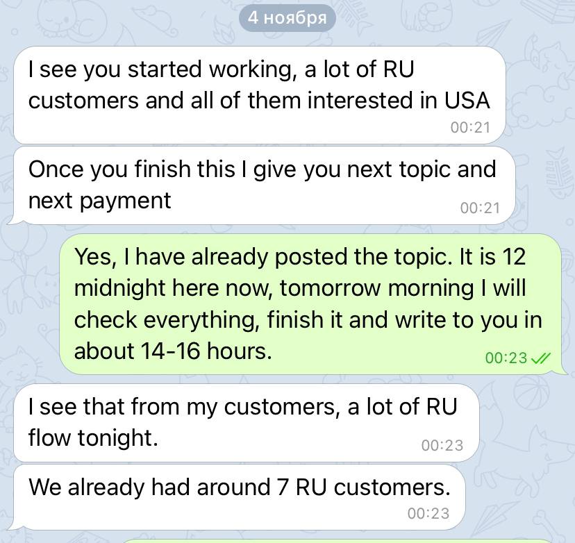 На связи с 10.00 до 22.00 по МСК. Постоянным клиентам небольшие скидки.