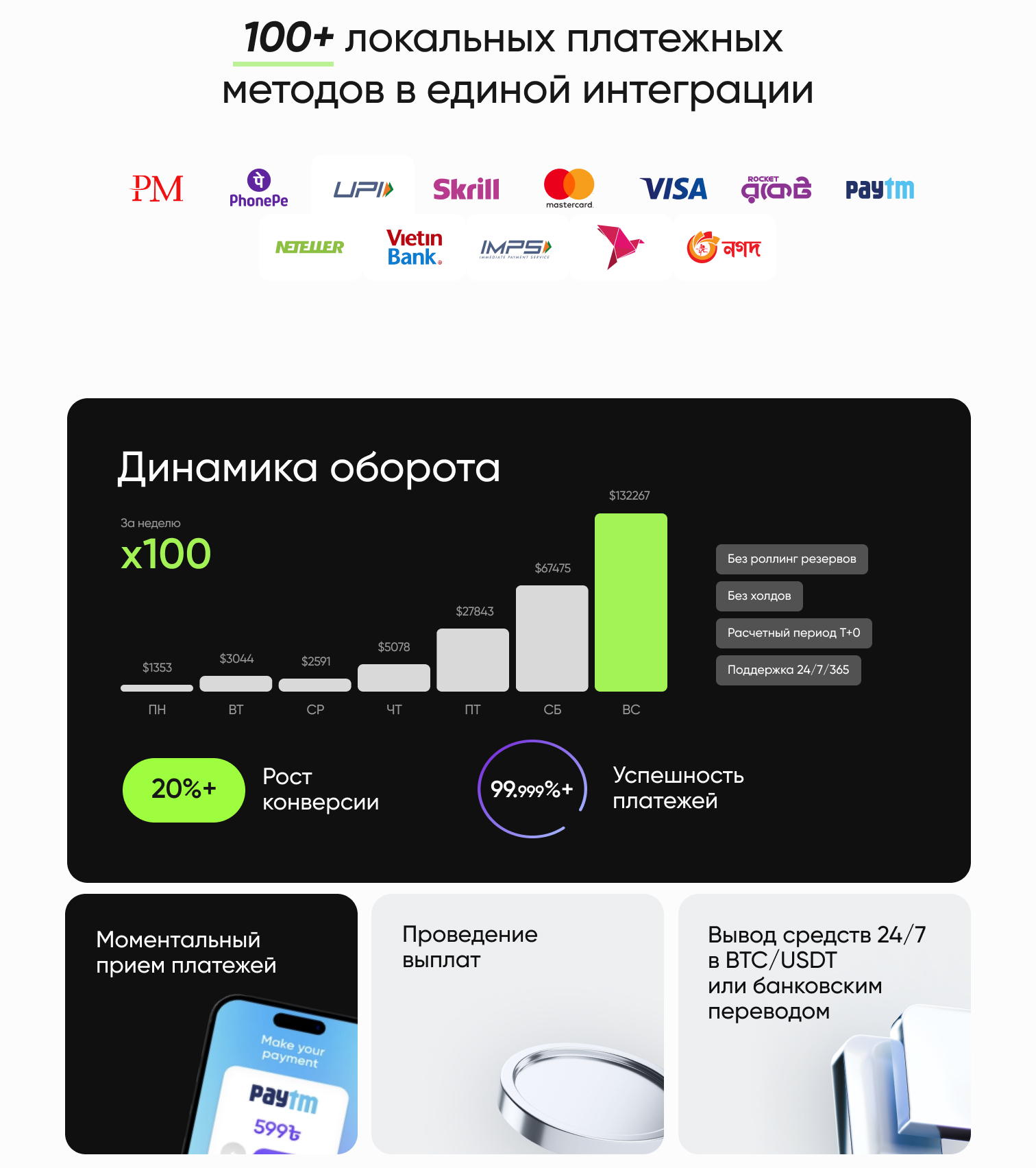 100+ локальных платежных методов в одной интеграции: bKash, Nagad, Upay, Rocket, PM, PhonePe, UPI, UPI S, IMPS, PayTM, Easypaisa, Jazz Cash, Skrill, Neteller, Vietin Bank, Visa, Mastercard и многие другие