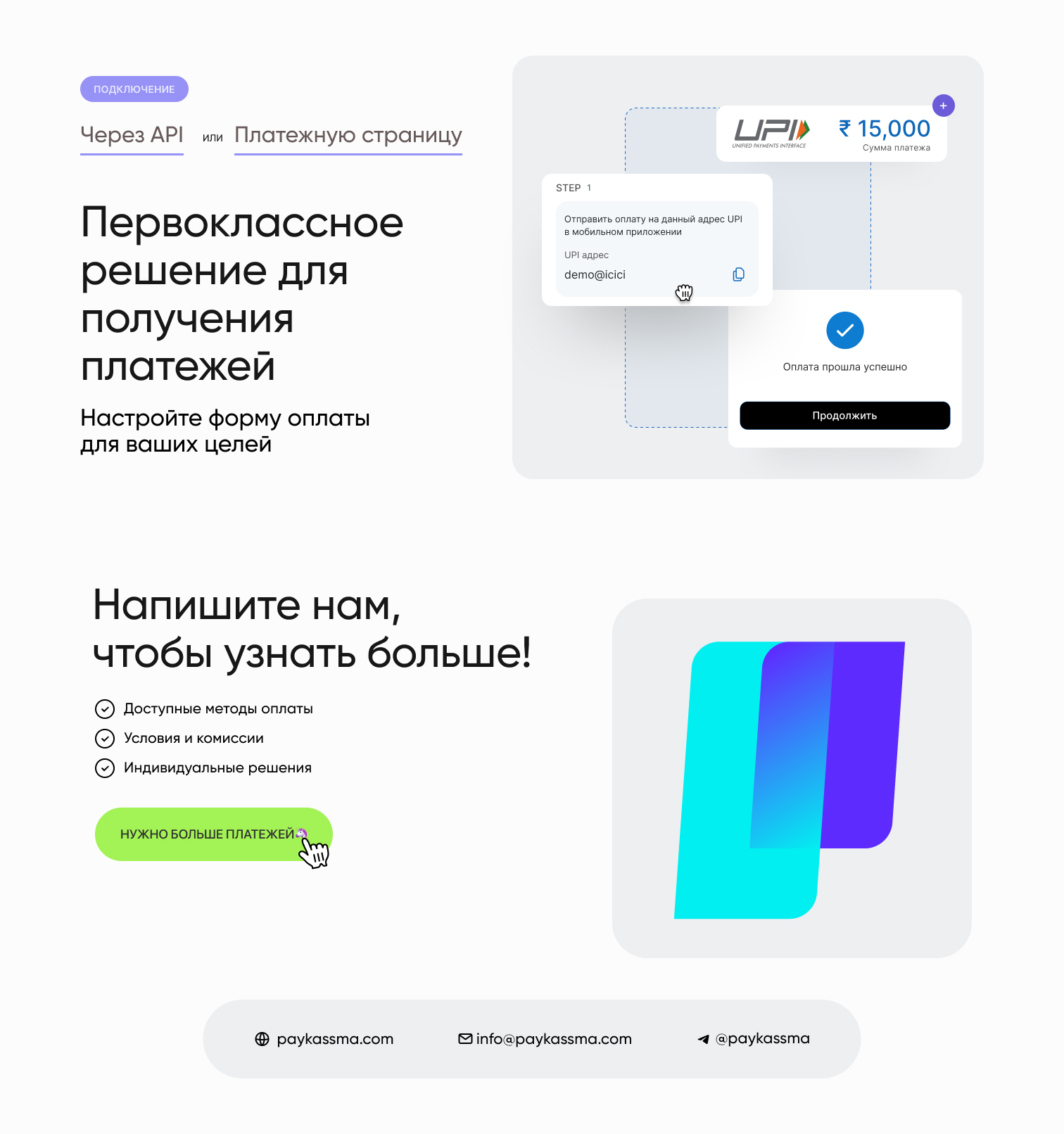 Простая интеграция через API или с помощью настраиваемой страницы платежа